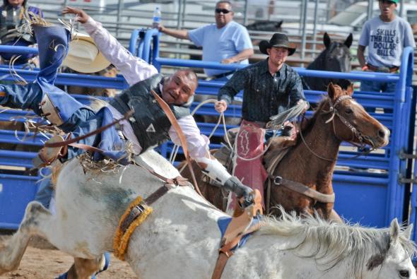 While there may be fewer competitors in some events, the first two bareback riders at Saturday’s performance were hospitalized. Picked up and carted off in an ambulance. Action you don’t normally see at the big events, Indian Rodeo competitors, don’t get bogged down with all the rules, regulations. They frequently hammer their gloved hand, locking it onto the beast they have drawn to ride. Since their hand can’t come loose, and if they keep their feet beneath them they have a shot at the money. In both cases Saturday, their feet flew out beneath them and they were beaten badly.