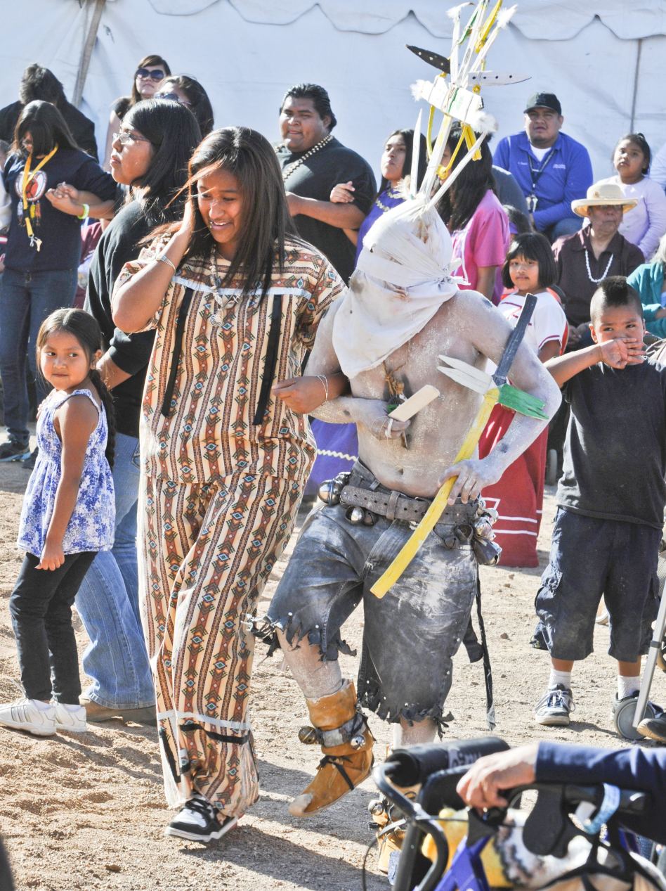 The Apache Clown from the San Carlos Crown Dancers takes a Tohono prisoner for a dance