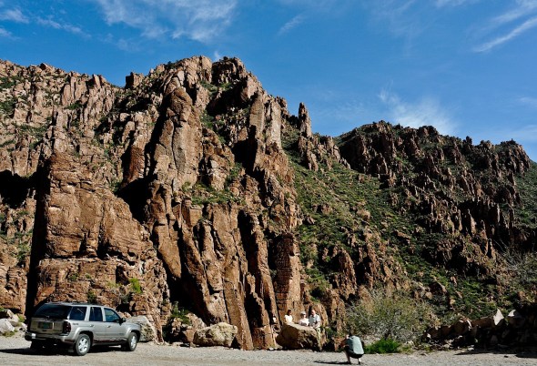 Driving Hwy 60 east from Phoenix, through the vastness of the Sonoran Desert, the heat and glare beats down on the windshield, Apache Leap Mountain stands above the Sonoran Desert just five minutes past Superior via Highway 60 up 1000 feet to Oak Flat Campground in the Shrub Oak-Pine Habitat. The name, Apache Leap, comes from an Apache band, so the story goes, who refused to surrender its land and move to the reservation. Instead the tribe jumped to its death here when finally surrounded by federal soldiers. So today Apache Leap is considered an ancient burial ground by the San Carlos Tribe, it’s the Tribes long-time summertime home where they have collected acorns for centuries and today use it as a sacred spot to minister their Apache Manhood ceremonies.