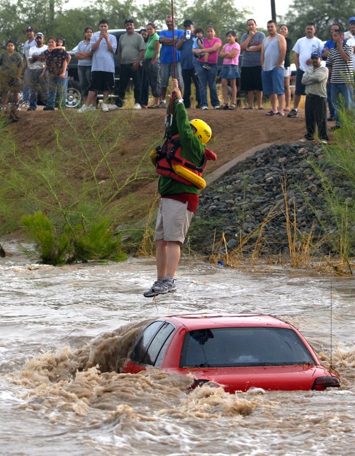 Because of the frequent whitewater rescues that ensue after every monsoon storm the Arizona legislature passed the “Stupid Motorist Law”, which corresponds to section 28-910 of the Arizona Revised Statutes, and states that any motorist who becomes stranded after driving around barricades to enter a flooded stretch of roadway may be charged for the cost of their rescue. The need for this law came from the lack of storm sewers in the deserts of the Southwestern United States, combined with heavy rainfall in the desert, usually associated with the summer. This lack of adequate drainage leads to short-term flooding. Many desert cities and towns don’t use culverts to channel minor washes beneath the roadway. Only major washes and floodplains have bridges over them. Consequently, during rain storms, storm runoff flows over the roadway. During hard, strong rain storms, the washes, underpasses, and large storm drains can flow fast and deep enough to pick up an automobile and carry it downstream. During particularly strong floods, one might see a motorist stuck in the middle of a wash, sitting on the roof of a dead car submerged to the windows. In such cases, if public emergency services (such as a fire department, or paramedics) are called to rescue the motorist and tow the vehicle out of danger, the cost of those services can be billed to the motorist, up to a maximum of $2,000…