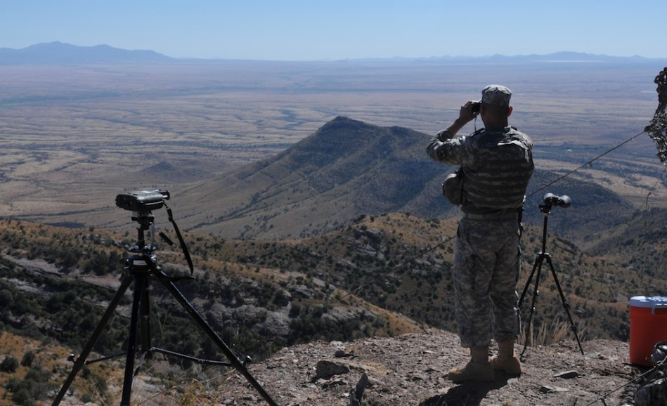 The US National takes a forward operating position on Coronado Peak to Monitor smuggling routes to the east and illegal immigration toward the west. “They know we are here, says one Guard member, “we’re just a deterrent !” “They pay me $5000 a month to sit on a rock, I will do that all year-long.”