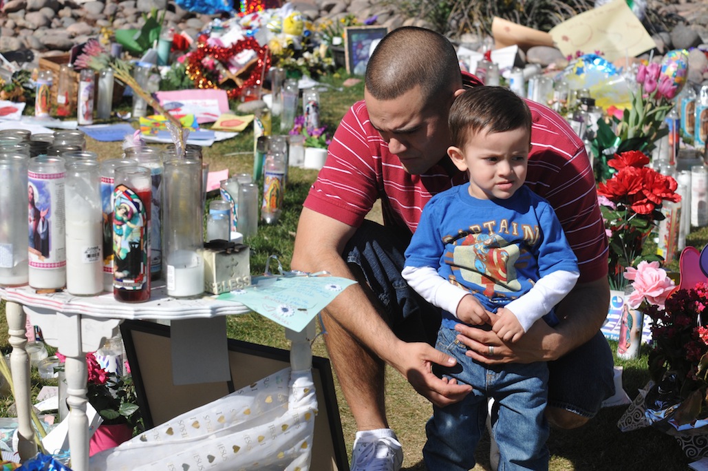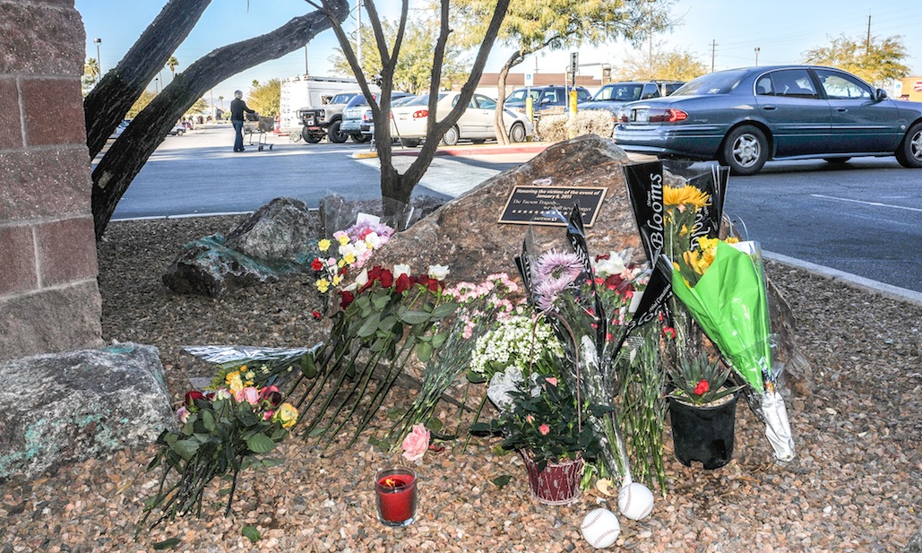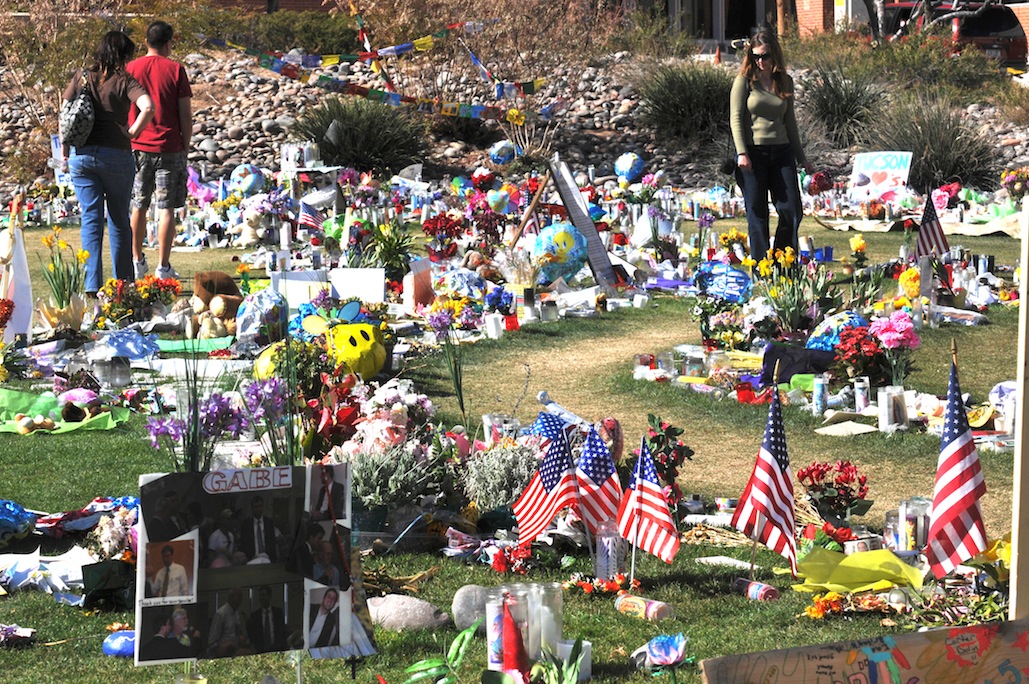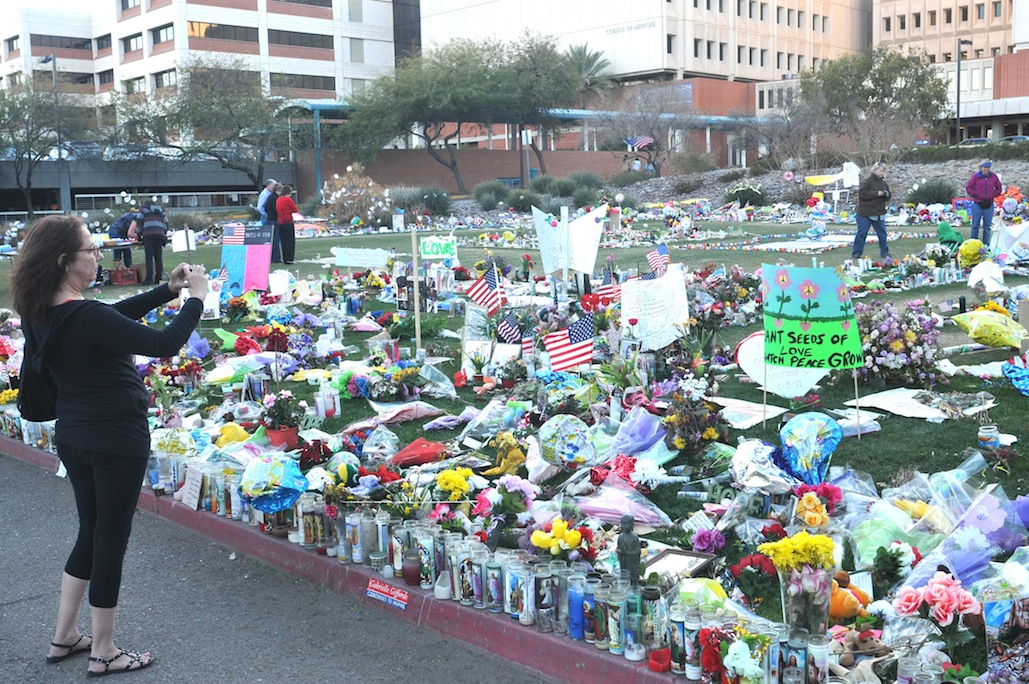 Tears were shed Tuesday as Tucsonans remembered the shooting two years ago that killed six and wounded nineteen. Bells rang throughout Tucson at 10:10am, where ever folks were-they stopped or went outside where churches and schools rang their bells, nineteen times, all in memory of Tucson victims and the hundreds victimized throughout the United States in eleven attacks since the Tucson shooting two years ago. Eleanor Percello, from Marana, wiped tears away Tuesday morning at the Safeway at Ina and Oracle Roads where the shooter killed nine year old Christina Greene, Gabriel Zimmerman 30, and Judge M. Roll, Dorothy Morris, 76; Dorwan Stoddard, 76; and Phyllis Schneck, 79. After the shooting in Tucson thousands visited the shrines and attended the vigils, each has shed a tear, you can’t help but feel touched by all the love, concern and sentiment expressed, “Let a new era of love begin with me” wrote one, “from this day forward I will…” said another. One was inspired to paint John Lennon’s words from “IMAGINE” on flagstone, including “Imagine all the people living Life in Peace”. President Obama came to Tucson and grieved. Since then Congress has done nothing.
