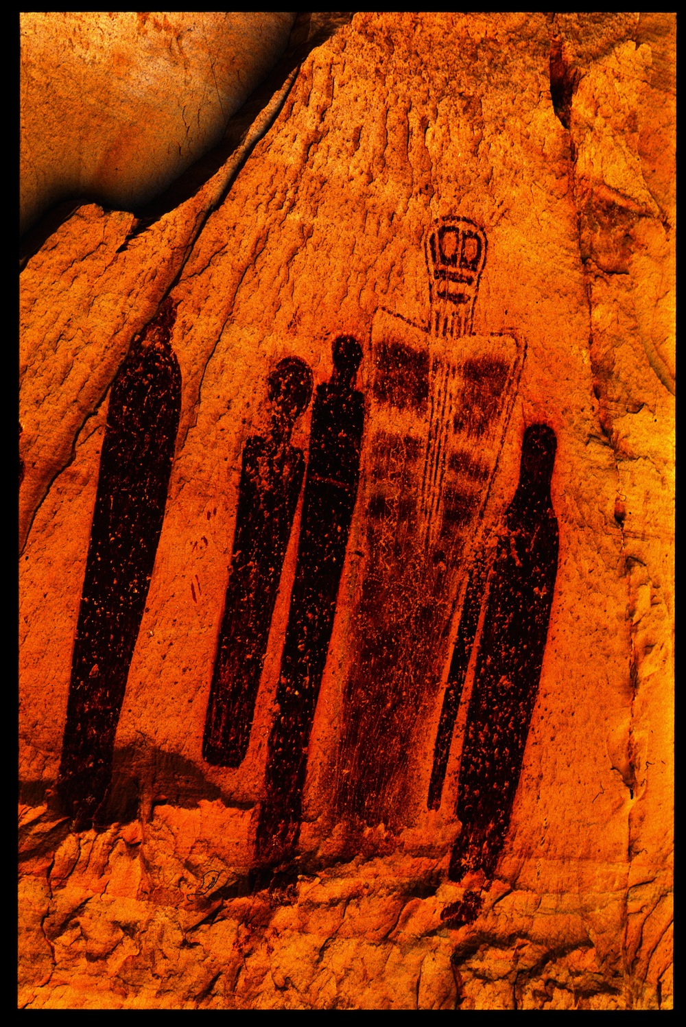 The Lower Butler Wash was chiseled by an artist pecking a straight controlled line, while the Holy Ghost Gallery was partially sprayed onto the limestone and both reflect this ghostly, ancestrial-spirit overtones which are absent in the Fremont Panels which highlight war-like motifs.