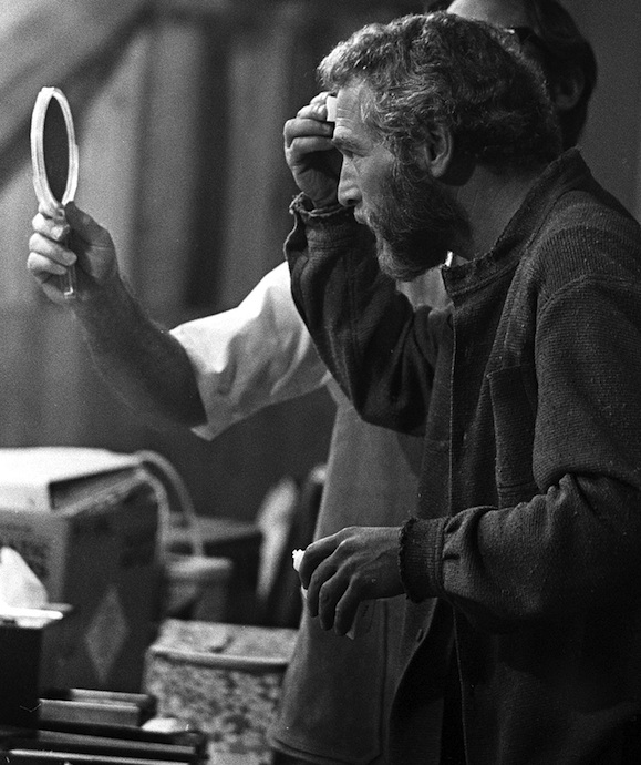 Paul Newman applies makeup in preparation to filming at Old Tucson, the “Life and Times of Judge