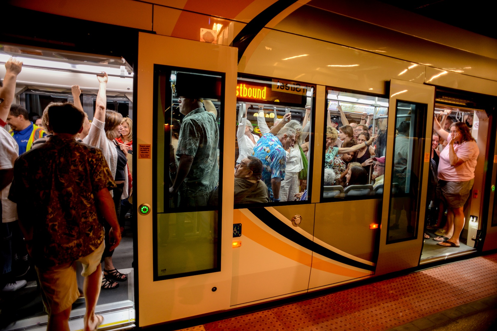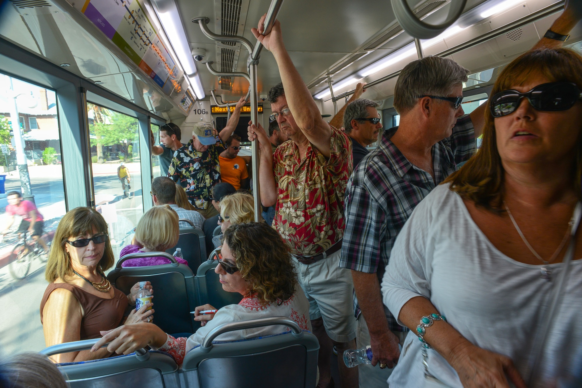 Pretty easy travel getting on a car and heading into town (the day before I hit the UA just before 5 pm and the street cars were all packed solid and everyone knew each other) but after 8 pm, when the Street Car was supposed to quit on Sunday (the overflow bus was full also) conductors continued to run because people continued to line up for the street car.