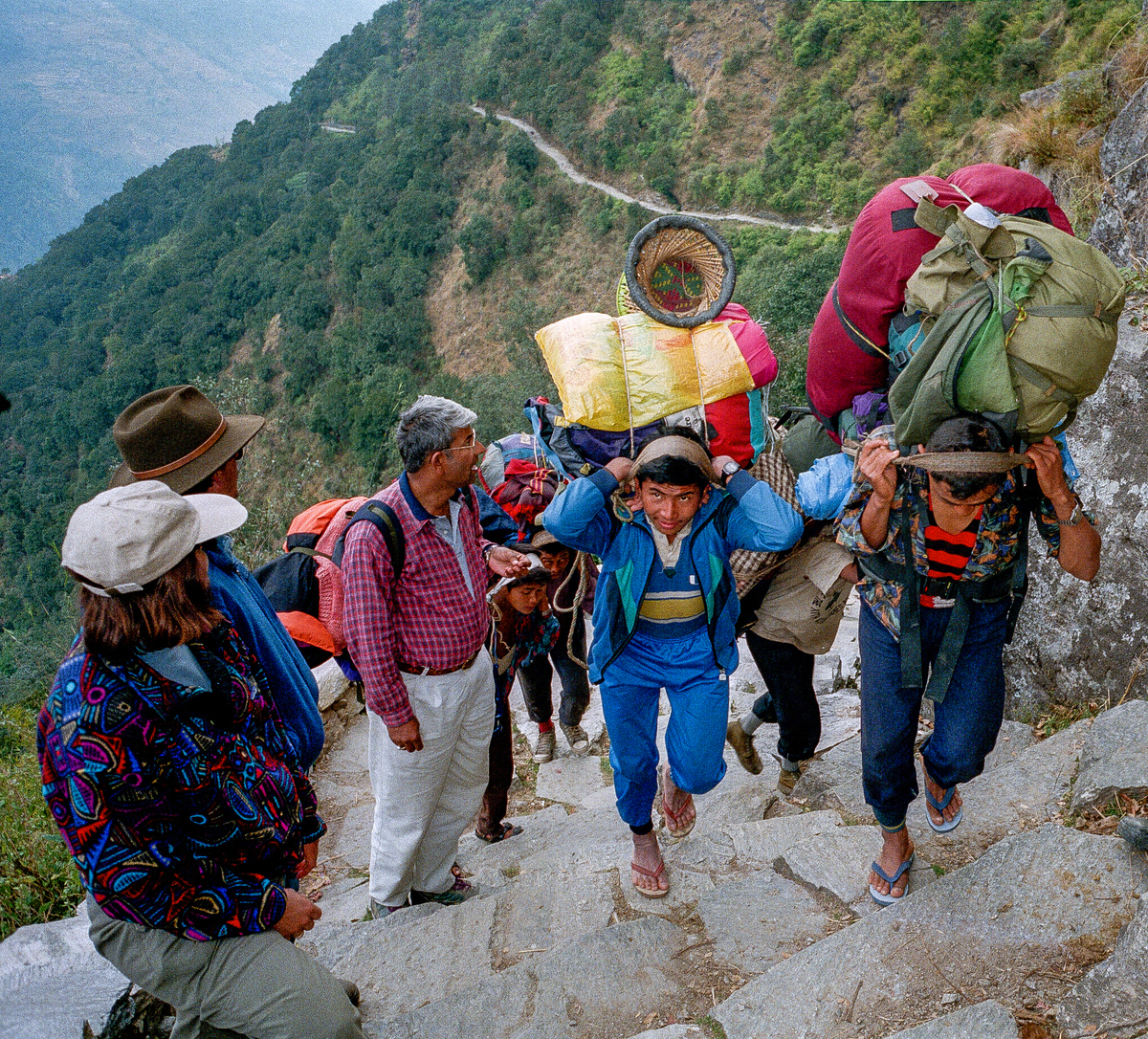 Before the roads were cut, if you want anything in or out of Annapurna you had to carry it or pay for it to be hauled in now locals are glad to see the progress. In 1997 a hundred years from the first white man’s visit to Nepal, I showed up and hiked up to Ghangdruk, three days in and two nights out, our expedition’s half-dozen camp boys, swelled to 28 sherpas, to carry provisions and camping gear. It was so neat, no roads, just a well worn trail! The same trail mankind had used since day one. Your feet leaving footprints where half of humanity have crossed over this mountainous trail. “HERE I AM FAR FROM HOME!” sang our camp boys around their warming fire. “NO ONE MISSES ME, I AM ALL ALONE.” NO SWEATHEART, MOTHER OR LOVED ONES…ALL ALONE!” they all sing delighted to have a job, with money coming in and sitting next to a warm fire. One of them would stay up all night with a Gurka knife watching over our tents and the entire camp, Germans the week before, had been robbed while eating dinner when someone with a knife slit their tents and helped themselves.