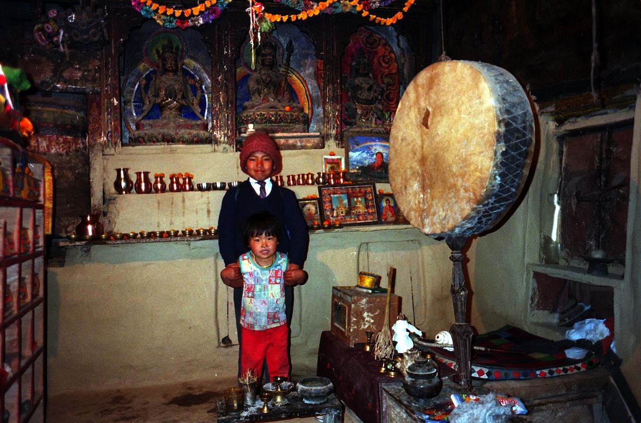 Eventually we will climb to 2000 meters to Ghangdruk on our third day of trekking, there at the cities edge we would be greeted by Nepalese Police who required we check-in (filling out some forms and flashing our Trekking Permits) before we could find our lodge where we would pitch our tents beneath the huge Fishtail formation known as Machhapuchre at a 22956 feet. The next morning I would arise early and walk the pathways through the community, enjoying meeting the residents-making some pictures and eventually being adopted by three boys who wanted to show me the basement of their large urban home. I followed them into the pitch dark room where after my eyes adjusted, I could barely make out a drum and some wall drawings and so I mounted my Nikon flash and made a photo. Since those were the good old film days, I didn’t see it was a ceremonial room for Hindu celebrations until I got home and got all my film developed and edited down.