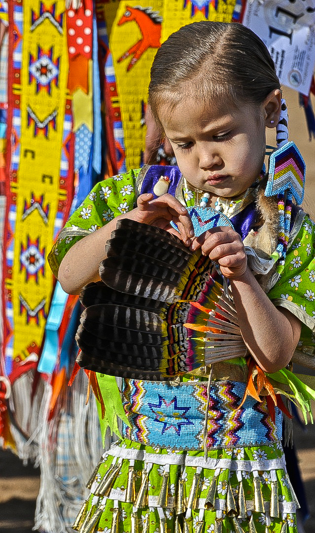 FANCY JINGLE DANCER STRAIGHTENS OUT HER EAGLE FEATHERS. This dance is a spiritual healing dance and the steps are fast-paced. Jingle regalia has the 365 jingles or tin cones that adorn each dress. Each cone represents a prayer and the total equals a prayer for each day of the year.