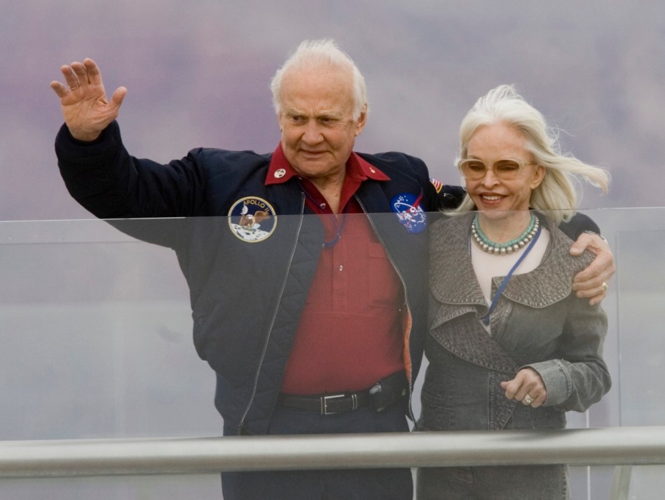 Former astronaut Buzz Aldrin and his wife Lois, waves to the crowd after making the ceremonial first walk Tuesday afternoon, March, 20, 2007, on the glass-bottomed Grand Canyon Skywalk located at Grand Canyon West’s Eagle Point in Arizona. Indian leaders, former astronauts and other visitors stepped gingerly beyond the Grand Canyon’s rim Tuesday, staring through a glass floor and into the 4,000-foot chasm below during the opening ceremony for a new observation deck. (AP Photo/The Arizona Republic, Rob Schumacher) ** MARICOPA COUNTY OUT, MESA TRIBUNE OUT, MAGS OUT, NO SALES **