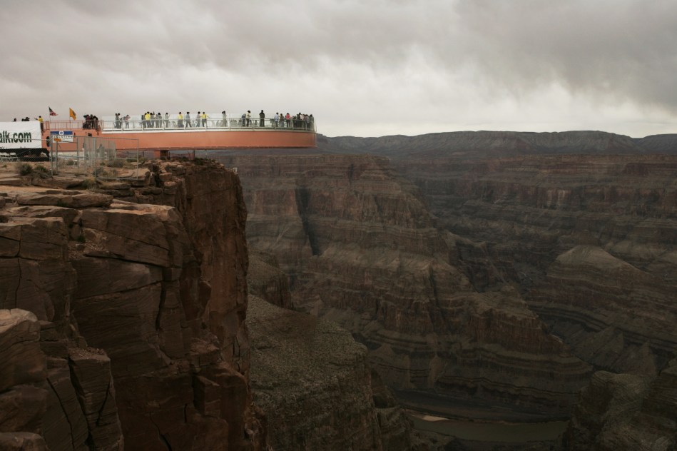 People walk on the Skywalk during the First Walk event at the Grand Canyon on the Hualapai Indian Reservation at Grand Canyon West, Ariz., Tuesday, March 20, 2007. The Skywalk opens to the general public on March 28. (AP Photo/Ross D. Franklin)