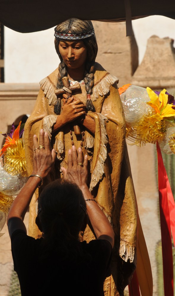 “I KNOW SHE LISTENS TO US” inserts Loretta who said an Our Father and Hail Mary each Wednesday for years. Loretta was at the San Xavier Mission’s Celebration of the Canonization of the first Native American Saint Kateri Tekakwitha (KA’-tehr-ee teh-kuh-KWIH’-thuh). Loretta came and got a seat on the second row because of the love she inherited in 1960 from her mother who came to the San Xavier Mission and prayed regularly and she had brought Loretta along. When Loretta’s thyroid cancer reappeared after 25 years she had no fear because he loves Kateri, her life has been touched by the humble little girl who loved the Cross and fought her illness. “People here are praying for me, she says of her San Xavier Parish!”
